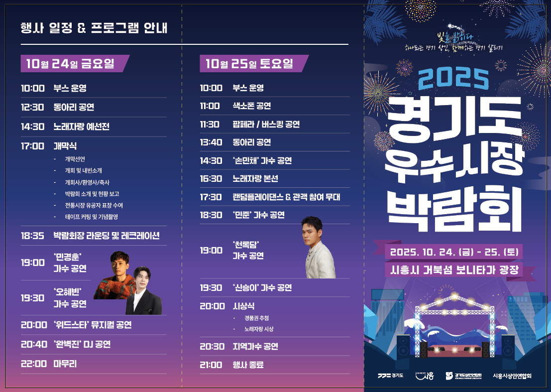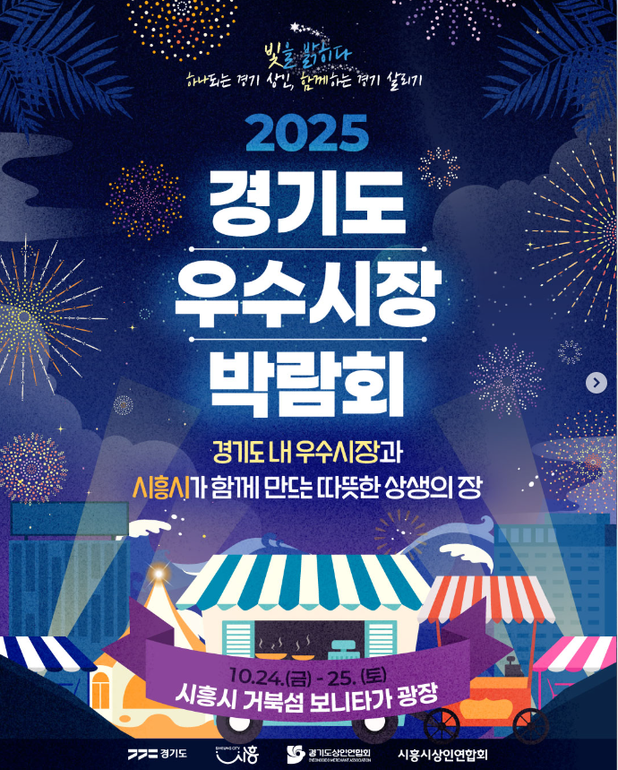 경기도가 매년 개최하는 우수시장 박람회를 2025년 올해에는 시흥시에서 10월 24일(금)과 25일(토) 양일간 개최된다고 해요. 경기도와 시흥시가 공동 주최하고 경기도상인연합회 및 시흥시상인연합회가 주관합니다.