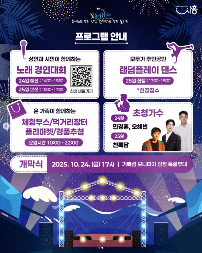 행사 첫날인 10월 24일(금)에는 경기도 상인동아리 공연을 시작으로 상인과 주민이 함께하는 노래자랑 예선, 전통시장 활성화 유공자 표창, 테이프 커팅식 등 개회식이 진행됩니다. 이어 초대 가수 민경훈, 오혜빈의 축하공연과 뮤지컬 공연, 거리 공연(버스킹) 무대가 꾸며집니다.